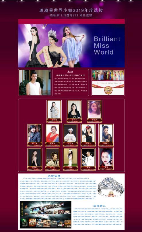 据相关璀璨星世界小姐机构全球执行主席—导演龙旭最新发布与步局就本次选拔精彩才刚开始,星光璀璨2019,上100名世界各地区优秀选手参与报名,本着国际美学中国电影文化,不只是一场选美,而是具有综合迥然不同的风情文化将在2019璀璨星世界小姐相约成都盛放。
